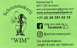 Schoenmakerij “WIM” is sinds 1985 gevestigd in Arnhem, op het huidige adres Klarestraat 8 (hoek Kromme Elleboogsteeg) sinds 1997. Schoenmakerij “WIM” is een echt familiebedrijf waar drie generaties schoenmakers actief werkzaam zijn geweest.